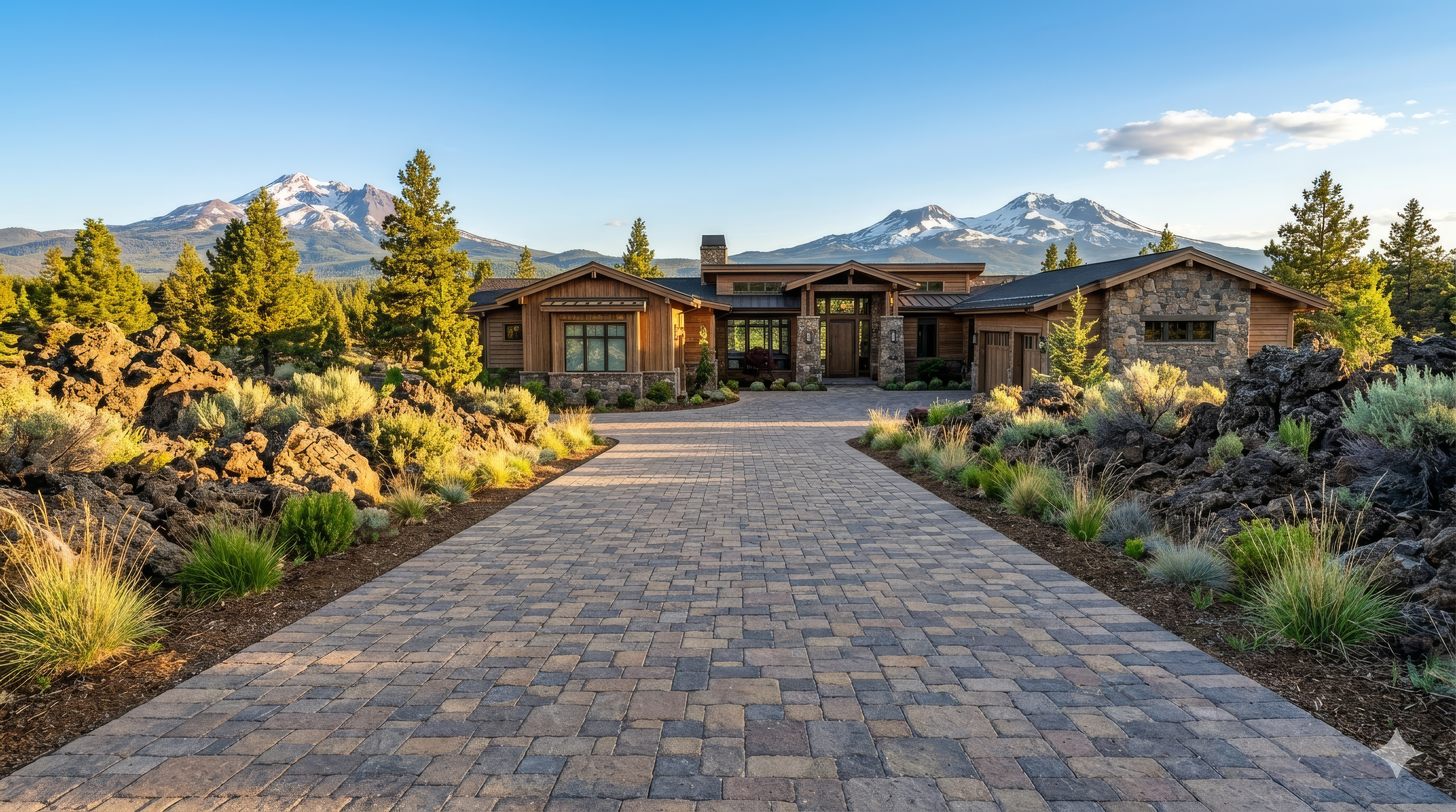 We design driveways that fit the property — wide aprons with banded borders for estate-style homes, clean large-format slabs for modern builds, tumbled earth-tone pavers for homes that want to feel like they grew out of the Central Oregon landscape. The material choices are wide.